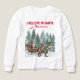 This fun shirt is perfect for all those boys and girls who love dinosaurs. Santa is riding in his sleigh pulled by two Tyrranosaurus Rex dinosaurs. One dinosaus is wearing a Santa hat and another has a scarf wrapped around his head and neck. A beautiful forest is behind them.