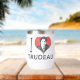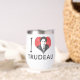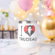 Corazón Trudeau. Amo A Justin Trudeau. Con una hoja de arce canadiense roja. Primer Ministro liberal de Canadá. La cara de Justin hecha como un ilustracion gráfico y terminada en una mirada estridente y angustiada.