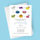 Esta invitación de icono de línea de balsa de piscina para fiesta en la piscina presenta un diseño divertido y juguetón perfecto para una celebración de verano. La ilustración de ocho flotadores de piscina coloridos, incluyendo una dona, dragón y unicornio, agrega un toque caprichoso a la invitación. La caligrafía moderna y la tipografía fácil de leer hacen que sea fácil transmitir los detalles importantes de la fiesta, como fecha, hora y ubicación.