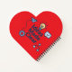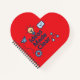 Un simple cuaderno de espiral en forma de corazón rojo con el diseño "Ideas hechas claras", con iconos como una bombilla y equipo.