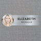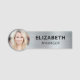 Etiqueta de identificación de nombre metálico falso plateado cepillado moderno. Sube la foto del empleado y agrega su nombre y título en tipografía simple.