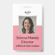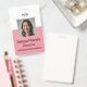 Insignia vertical rosa personalizado que incluye una foto y nombre del empleado, texto de personalizable para el número de identificación del empleado, rol, título, ubicación u otros detalles clave. Añada el logotipo de su empresa en la parte superior. La parte posterior de la insignia incluye un campo de texto personalizado para obtener información u otros detalles importantes. Este diseño permite una fácil personalización, asegurando que cada insignia sea única y satisfaga las necesidades específicas de su empresa.