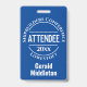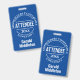 Una insignia para un participante de la conferencia. Cambie la redacción a sus detalles. Tarjeta de asistencia a la conferencia. Insignia oficial del asistente. Texto blanco sobre fondo azul.