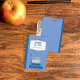 Un estudiante azul divertido pasa una insignia en forma de cuaderno falso y con un gato durmiendo encima de una pila de libros. © ArianeC Ilustraciones-Todos los derechos reservados