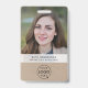 Simple y elegante placa de identificación de kraft rústico corporativo que puede ser fácilmente personalizada con la foto de identificación de su empleado, nombre, posición, logotipo de la empresa, detalles de negocio y código QR o código de barras. El diseño es elegante y cuenta con una moderna tipografía minimalista y una bandera transparente. La imagen que se muestra es para fines de ilustracion y sólo se sustituye por la suya. La imagen de marcador de posición es de una joven con una chaqueta marrón de pelo largo.