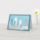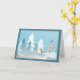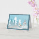 Tarjeta de saludo de vacaciones ilustrada con iglesia, árboles, nieve y ciervo.