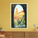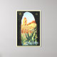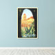 Afiche de viaje europeo de ilustracion vintage de Palermo, Sicilia, Italia con la iglesia de San Giovanni degli Eremiti, jardines y campanario vistos a través de arcos arquitectónicos. Iglesia de San Juan de los Hermanos.