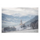 Foto de la iglesia de St. Pankraz en un paisaje alpino en la nieve rodeada de nubes y niebla en una colina con vistas al valle de Zillertal con los Alpes al fondo en Fügen, Austria en invierno.