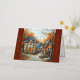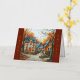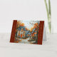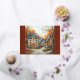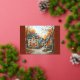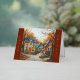 Esta imagen representa una escena otoñal serena y encantadora en un entorno rural. El punto focal es una acogedora casa de piedra con tejados de pizarra y una puerta de color rojo brillante rodeada de un follaje otoñal vibrante. En las cercanías, otras casas con encanto, con una iluminación cálida en las ventanas, crean un ambiente idílico. Un sendero adoquinado serpentea por el espacio, bordeado de macetas de flores, una bicicleta de época y una acogedora zona de estar al aire libre con un toldo a rayas. Árboles vacíos con hojas de colores enmarcan la escena, y pájaros se dispersan por el cielo suave y nublado.