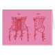 Un viejo ilustracion de una patente de corsé de color rosa adorna estas camisetas y otros artículos.
