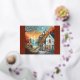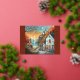 Esta pintoresca ilustración captura un encantador pueblo costero bañado en los cálidos tonos de una puesta de sol de otoño. Las calles empedradas serpentean hacia una playa serena, donde un barco de vela flota en aguas tranquilas. Cabañas acogedoras con ventanas iluminadas y decoraciones festivas de otoño, como calabazas y luces de cuerda, crean una atmósfera acogedora. Un faro se alza majestuosamente en la cima de un acantilado, dominando el mar, mientras las aves vuelan por el cielo, añadiendo un sentido de libertad y tranquilidad. La mezcla de tonos cálidos y fríos realza el ambiente soñador y nostálgico de la escena.