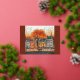 Esta imagen retrata una caprichosa escena de una calle otoñal en una ciudad de inspiración europea. El punto focal es un vibrante árbol naranja-rojo en el centro, con sus coloridas hojas girando por el aire. El árbol está rodeado de encantadoras casas en tonos pastel, grises y rojos, con ventanas cálidamente iluminadas que suenan un ambiente acogedor. La calle de adoquín cuenta con un carro tirado por caballos con un fuego brillante en su bravo, y algunos peatones caminan bajo las hojas que caen. La puesta de sol transmite un cálido matiz dorado sobre el lugar, lo que realza el ambiente romántico y nostálgico.