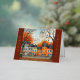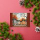 Este ilustracion capta una pintoresca noche de otoño en una pintoresca ciudad de estilo europeo. La escena es rica en cálidos tonos naranjas y dorados, mientras los árboles se deshacen de sus hojas, creando un hermoso contraste contra el cielo crepúsculo, donde una luna creciente y estrellas suaves brillan. La calle adoquinada está rodeada de encantadoras casas con ventanas decorativas, macetas de flores y toldos a rayas. Algunos edificios tienen interiores luminosos, mientras que las bicicletas están aparcadas a lo largo de las aceras, creando un ambiente tranquilo y nostálgico. Los pájaros encaramados en las ramas y algunos en vuelo dan al escenario un toque dinámico, haciéndolo sentir vivo. Una persona que monta un triciclo con un paraguas sugiere un relajante ritmo de vida, haciendo hincapié en la comodidad del entorno.