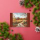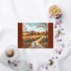 Esta imagen representa una pintoresca escena otoñal con un rústico granero rojo rodeado de un vibrante follaje otoñal. El sinuoso camino de tierra, salpicado de calabazas, conduce a través de un campo de oro hasta el granero. Árboles con hojas naranjas, rojas y amarillas enmarcan la escena, y se pueden ver cuervos volando a través del cielo nublado. El entorno es acogedor y nostálgico, evocando el encanto de la temporada de cosecha en una granja de campo.