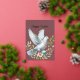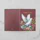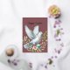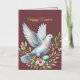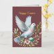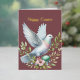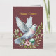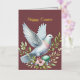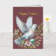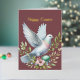 La imagen muestra una hermosa paloma blanca con sus alas extendidas. La paloma tiene suaves tonos pastel en el cuello, combinando tonos rosas, verdes y azules. Lleva una rama de olivo en su pico, simbolizando la paz. Alrededor de la paloma hay elementos botánicos exuberantes, como varias hojas verdes, bayas pequeñas y un solo florecimiento rosa. En el follaje hay un huevo de color pastel que refuerza la temática de Pascua. La obra de arte se presenta en un estilo acuático realista con un aspecto suave y delicado.