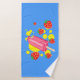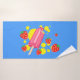 Toalla de baño de temática veraniega. Diseñado con palas rosadas y algunas fresas rojas que caen alrededor de la palmilla junto con algunas salpicaduras de pintura amarilla. Fondo azul.