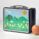 El original y bonito ilustracion de esta original y divertida lonchera de niños es una pintura al estilo "nieve", luminosa y colorida. La imagen muestra algunas ovejas blancas y onduladas de color negro pastoreando detrás de los daffodils en la ladera de la colina mientras el gran sol brilla sobre ellas. Al fondo se ven pequeños árboles recubiertos de hojas con manzanas rojas. Esta bolsa única de colores tiene el divertido lema "¡Que el sol brille siempre en Ewe!" y es apropiada para personas de todas las edades.