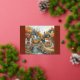 Esta imagen retrata un pueblo sereno e idílico con un suave arroyo sereno que serpentea por el centro, cruzado por un puente de piedra arcaica. Las casas son pintorescas y coloridas, con paredes azul claro, postigos rojos y florecientes macetas. El pueblo está rodeado por un follaje otoñal que pinta los árboles y el paisaje en cálidos tonos de naranja, oro y rojo. Pequeños botes flotan tranquilamente en el arroyo, mientras que las hojas se dispersan sobre la superficie del agua. El ambiente es tranquilo, evocando un encanto atemporal y la armonía con la naturaleza.