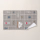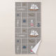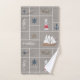 Ilustracion temático náutico con la decoración del caballo de mar, del barco de navegación, de la rueda de la navegación, del ancla, del faro, de los pescados, del seashell, de las estrellas de mar y del compás en rectángulos en fondo arenoso del grunge