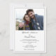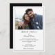 Esta simple invitación a la boda incluye una foto horizontal en la parte delantera y un texto simple para la invitación. El reverso es negro con una caja blanca que contiene las indicaciones de RSVP.