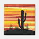 Resumen de ilustracion geométrico del desierto con rayas diagonales amarillas, naranjas y rojas y decoración de cactus. Agregue su nombre/monograma o elimine el texto.