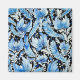 Un impresionante cuadro de estilo tradicional de Petrykivka presenta delicadas flores azules y azul cielo que florecen vibrantemente sobre un fondo negro profundo. Cada pétalo es meticulosamente detallado, mostrando intrincadas pinceladas y patrones ornamentales típicos de este arte folclórico ucraniano. El diseño floral irradia elegancia y armonía, con arreglos simétricos y sutiles gradientes que resaltan la habilidad del artista. El telón de fondo oscuro intensifica los colores, haciendo que las flores parezcan casi luminosas, mientras que elementos ornamentales más pequeños como hojas y tendrilos agregan un sentido de movimiento y vida a la composición.