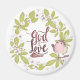 El imán de escritura de cita inspiradora representa un simple diseño de corona con flores blancas, vegetación y un adorable ladrón joven. Presenta una porción del Verso de la Biblia 1 Juan 4:16, "Dios es amor".