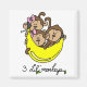 Tres adorables y pequeños monos cuelgan al borde de un gran plátano amarillo en 3 camisetas de los Monos Li, pantalones de vestir, tarjetas, pegatinas, bolsas de té y otros artículos de mono y regalo.