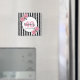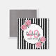 Un imán para un fiesta de 40 años. Rayas verticales clásicas delgadas en blanco y negro como fondo. Con rosas rosas rosa femeninas y femeninas como decoración. Un marco blanco y rosa en la parte delantera con una plantilla para la edad, el nombre y la fecha. Número de edad en rosa, nombre y fecha en negro. El nombre está escrito con un guión de estilo con letras a mano. Se puede utilizar como un keepsake, un favor de fiesta o como un recordatorio de fecha para los invitados