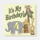 Un diseño con temática de safari de una jirafa, un mono sentado en un árbol, un elefante grande con el número 4 en él, y el texto Es mi cumpleaños en la coordinación de camisetas de cumpleaños número 4, botones, invitaciones a fiestas, notas de agradecimiento y franqueo. También camisetas para el resto de la familia y fiestas.