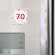 Un imán para una fiesta de cumpleaños 70 niñas, como un favor o guardar el recordatorio de fecha para sus invitados. Ramas con flores de magnolia rosa, violeta y dorada. Elegante fondo blanco. Plantillas para un nombre, edad 70 y fecha. Fecha de nacimiento o fecha del fiesta/aniversario. Letras doradas y burdeos. El nombre está escrito con una escritura de estilo con letras a mano moderna.