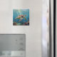 A sea turtle themed magnet with an illustration of a sea turtle under a calm teal sea swimming among the coral on the ocean floor with sun rays beaming down on him through the aqua water. Add a coastal feeling to your beach home.