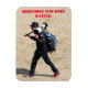 Un imán gracioso para tu refrigerador - A veces el tamaño importa. Tiene una foto de un fotógrafo que lleva una lente enorme sobre sus hombros. La foto fue tomada en St Malo, Francia, en un concurso de kitesurf.