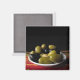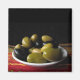 Este imán cuenta con una deliciosa variedad de deliciosas aceitunas como Picholine, Nicoise, Kalamata, Cerignola Verde y Cerignola Negra. Están dispuestas en un plato blanco sobre una colorida alfombra roja, amarilla y verde sobre un fondo negro para una composición artística y apasionante de la vida.