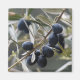 Fotografía de aceitunas negras maduras en una rama de un olivo.