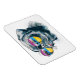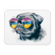 Este diseño presenta un pug que mira a través de lentes de sol en una escena tropical.