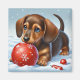 Un cachorro de dachshund lindo jugando con una pelota de Navidades rojos en un ambiente invernal nizado. Captura de la alegría, la inocencia y el encanto de la temporada de vacaciones con colores vivos y ambiente alegre.