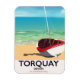 Torquay, poster de vacaciones Devon imprimir un barco costero en una playa.