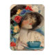 Lovely young lady with colorful flowers on her hat drinking a nice cup of afternoon tea. Vintage Art Deco watercolor illustration by Harrison Fisher (1925).