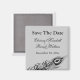 Unas plumas de pavo real brillantes adornan esta invitación de una nueva forma de moda. El fondo de este imán es un gris claro y parte de la colección completa de bodas, Shake your Tail Feathers (plata).