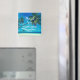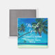Un imán conmemorativo de agradecimiento de boda. Diseñado con una foto temática tropical que presenta palmeras de coco que se extienden a lo largo de una playa aislada de arena blanca. Aguas turquesas y un cielo azul azur en el fondo. Agregue fácilmente su nombre y ubicación de la boda y la fecha.