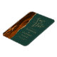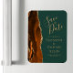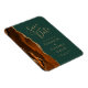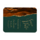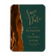 Este elegante imán para guardar la fecha de la boda tiene un borde de ágata de acuarela naranja quemada recortado con brillo dorado falso. Personalice fácilmente el texto dorado sobre un fondo verde oscuro.