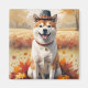 Una pintura acuarela de un perro alegre sentado en medio de un montón de hojas caídas vibrantes, rodeado de pequeñas calabazas y bellotas dispersas. El perro lleva un pequeño gorra peregrino y vigas de alegría, capturando el espíritu del Día de Acción de Gracias. Como telón de fondo, los campos de suave cosecha y los árboles de tonos dorados crean un ambiente campestre tranquilo. Las texturas suaves y los tonos cálidos y mudos del otoño le dan al lugar un ambiente acogedor y nostálgico, perfecto para celebrar la belleza de la temporada.