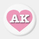 Este imán presenta un corazón rosado que contiene las letras en negrita, blanca y alta del funda AK, la abreviatura oficial de Alaska, la última frontera.