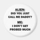 Por el amante del sarcasmo en todos nosotros. Echa un vistazo a este ingenioso "Alien: ¿Acabas De Llamarme Papi? Yo: No me han llamado mucho" diseño sobre ropa y regalos.