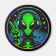 Un alienígena verde limón que da una señal de paz, usando auriculares, en un agua con estrellas en el cielo nocturno. Guay extraterrestres otros arte de ai mundano.