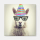 Está listo para un fiesta. Una alpaca en un gorra fiesta y gafas.