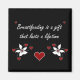 Este imán presenta texto blanco leyendo El amamantamiento es un regalo que dura toda una vida decorado con corazones y flores sobre un fondo negro.