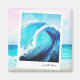 Una vibrante representación de una ola oceánica curvada en tonos azules es capturada en un marco de estilo polaroide, situado en un tranquilo paisaje marino. La frase "Amar el Océano" está elegantemente inscrita debajo de la ola.