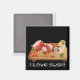 ¡Una visión para hacer agua de boca a cualquier amante del sushi! Una selección de sashimi, nigiri y makis descansan sobre una tradicional tabla de madera. Atún, salmón y cola amarilla en tonos rojos, rosas y naranjas hacen una presentación colorida junto con la pila de jengibre naranja y wasabi.
